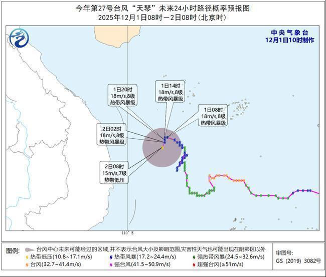 r大风预报:12月1日14时至2日14时,受“天琴”影响,南海中西部和西南部海域、西沙群岛附近海域将有6~8级大风、阵风9~10级。