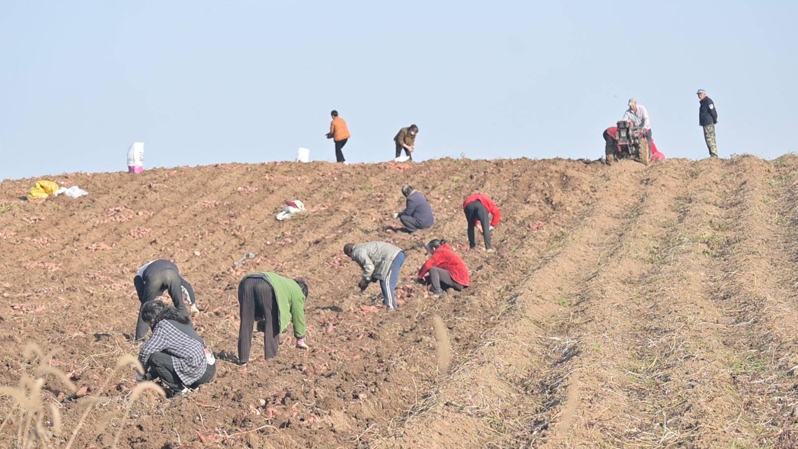 在鲍河村红薯种植基地,农机穿梭,泥土翻涌间,一垄垄饱满的红薯破土而出。村民们紧随其后,熟练地进行捡拾、分拣和装筐,展现出一幅生动的丰收画卷。